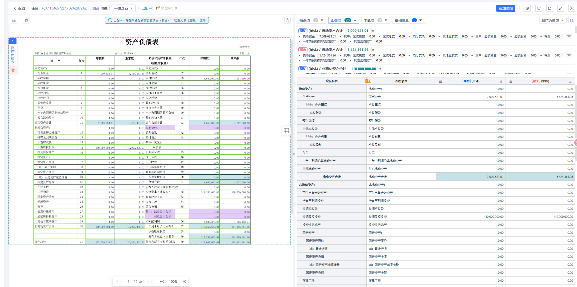 3.结果可视化呈现:快速识别解析为标准化的财报数据,不同高亮颜色区分正确项、错误项、以及未匹配项。