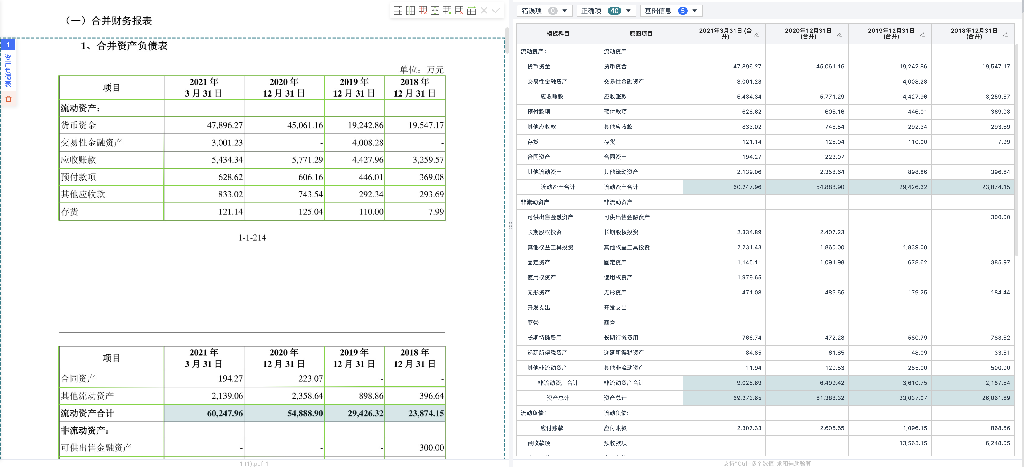 在解析完成后,通过智能数据自动化处理引擎,自动完成财报数据配平与校验,准确率达99.5%,而且系统自动基于财务科目间勾稽关系辅助核算,自动校验,对相关数据高亮显示,科目数值可相互定位对照显示,方便手动修正,进一步提升识别准确率。