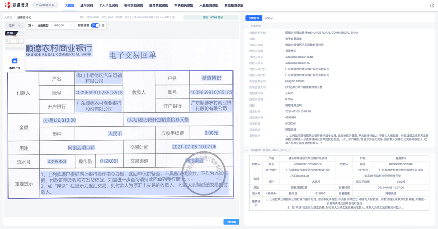 泛化能力强:大模型在新场景下的适应能力非常强。比如银行交易回单,每家银行的格式都不一样,过去可能需要对每一种格式都做针对性的模型训练,现在用大模型,不需要专门训练,就能达到较为理想的识别效果。