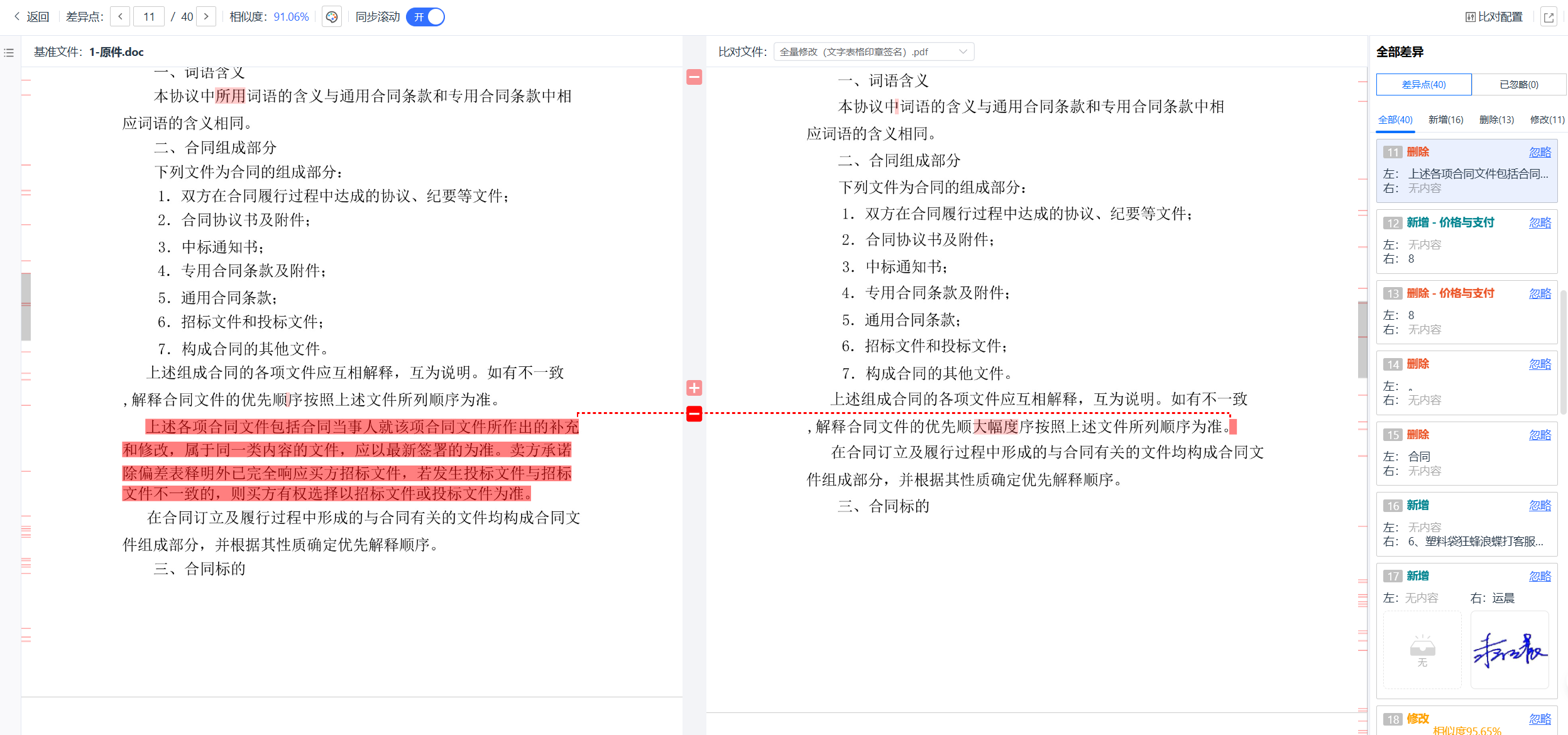 ●优势2 - 深度智能识别: 系统能够智能过滤掉因格式调整产生的“伪差异”,让用户聚焦于核心修改。同时,它能有效处理水印、骑缝章等复杂版式的影响,确保比对的纯净性。