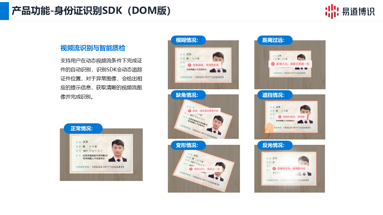 答:支持。行业领先的解决方案(如易道博识)均提供视频流动态检测功能。这能实时追踪证件在屏幕中的位置,并即时反馈图像异常(如反光、模糊),在用户按下快门前就引导其拍出合规照片。