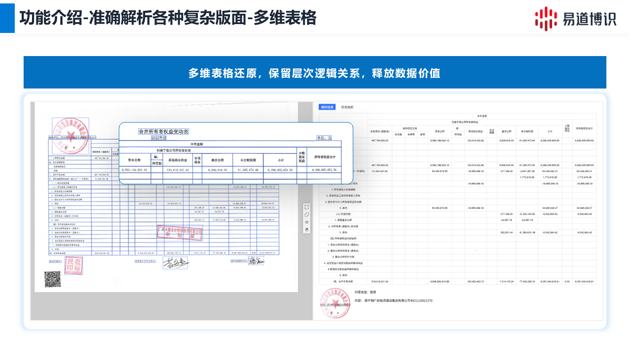 对于跨页表格,系统具备自动检测和拼接能力。它能识别出上百页年报中跨页表格的连续部分,并将其还原为一个逻辑完整的统一数据表,极大简化了财务报表等文档的数据处理。 对于多维复杂表格(如多级表头、嵌套单元格),不仅能提取数据,更能解析和保留数据间的层级与隶属关系。