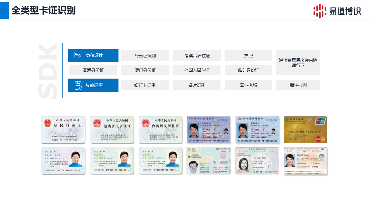 易识移动端识别SDK基于深度学习技术研发,一款在移动端即可实现服务器端综合性能的智能产品。支持身份证、银行卡及各类通用证照的毫秒级识别,识别准确率超99.5%。